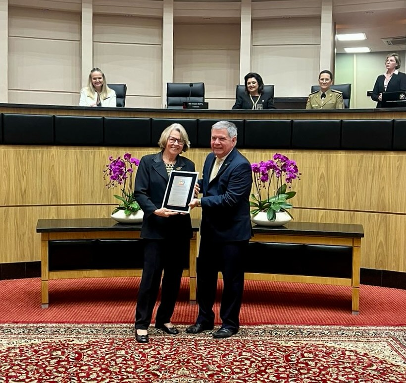 O tributo integrou a cerimônia dedicada às Mulheres Referências em Santa Catarina, reconhecendo trajetórias que se destacam pela contribuição à sociedade e pelo impacto positivo em diferentes áreas.