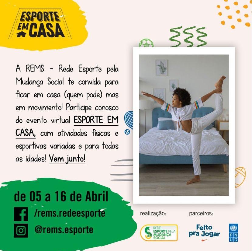 O Instituto participará na próxima quinta-feira (8) do “Esporte em Casa”, um evento promovido pela Rede Esporte pela Mudança Social (REMS) para marcar o Dia Internacional do Esporte para o Desenvolvimento e pela Paz, que é celebrado nesta terça-feira (6). A ação teve início na última segunda-feira (5) e se estenderá até 16 de abril, com o objetivo de incentivar as pessoas a ficarem em casa quando possível durante a pandemia de Covid-19 e mesmo assim se manterem ativas fisicamente.